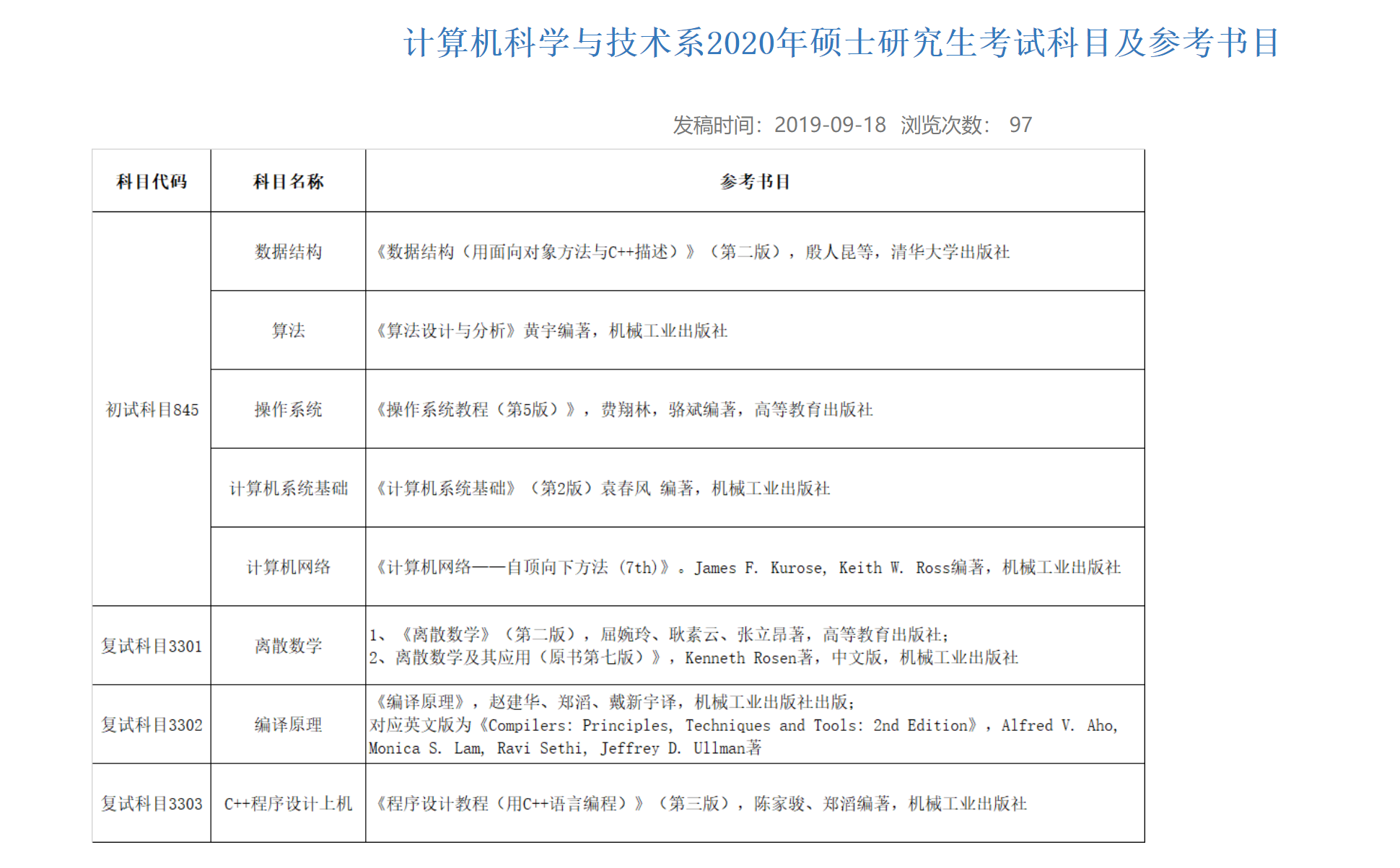 • 原南京大学计算机科学与技术考研科目代码为845数据结构、操作系统、计算机系统基础、计算机网络但是2020年发布的招生目录中显示考研科目代码为408数据结构、计算机网络、操作系统、计算机组成原理