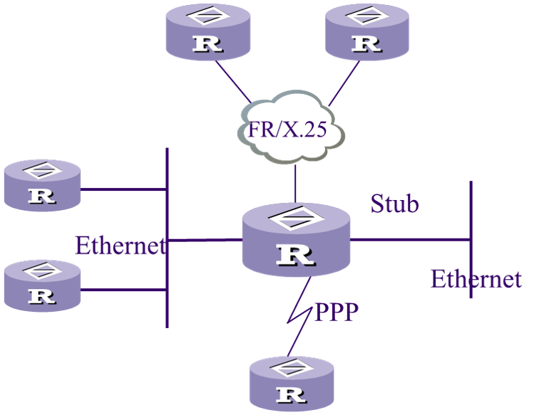 - Stub net:末端网络拓扑结构,路由器直连其他PC,网段中没有其他运行OSPF协议的网络设备。