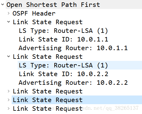 LSR:Link-State Request 请求链路状态,在数据库同步过程中使用,请求其他角色发送自己失去的LSA最新版本。内容包括所需要的LSA的摘要。