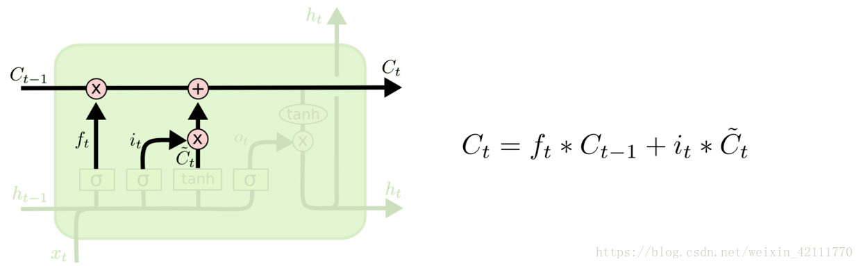 为输入门的两个输出乘法运算,表示有多少新信息被保留,基于此,我们就可以把新信息更新这一层的细胞状态