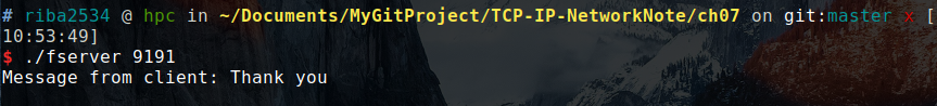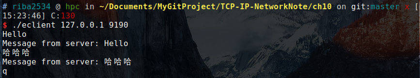 运行的时候,首先在 9190 端口启动服务,然后 hserver 就会一直等待客户端进行连接,当客户端连接位于本地的 IP 为 127.0.0.1 的地址的 9190 端口时,客户端就会收到服务端的回应,输出Hello World!
