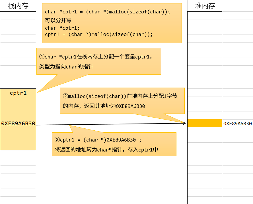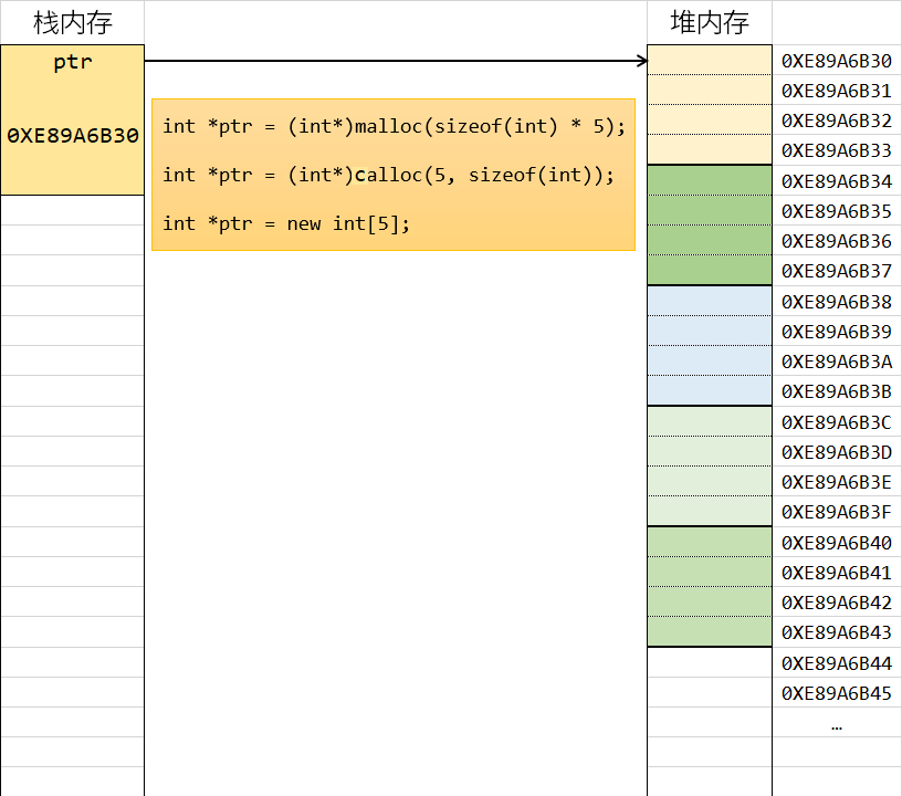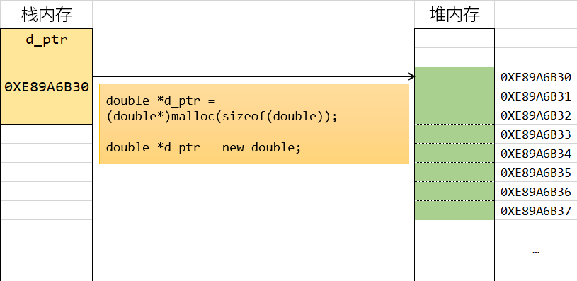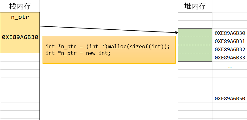 实际内存要复杂得多,本图只是简单示意,以下所有示意图,主要目的是用于理解指针的使用,因此可能有些不是特别严谨,不做过多深入。所有图示以Windows系统的处理方式作图,其他平台会有差异,但也不影响对指针的理解