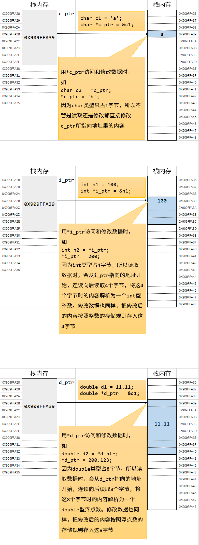 - 指针是强类型的,声明时必须指明类型,因为程序需要根据类型判断需要解析多少内存数据以及如何进行解析