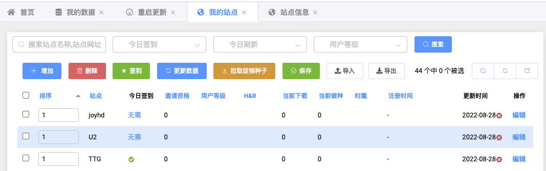 | 序号 | 站点 | 获取种子 | 签到 | 个人数据 | 推送种子 | 备注 |